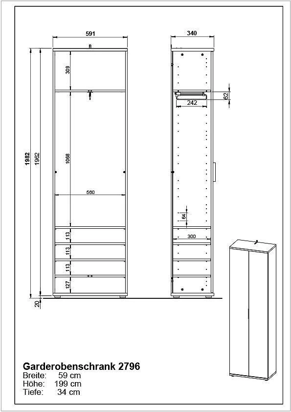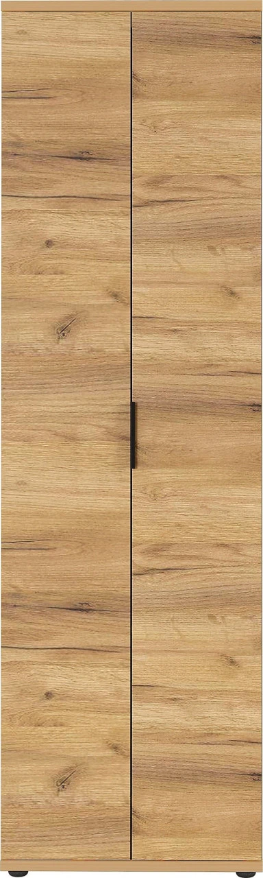 Sie müssen sich mit diesem Garderobenschrank keine Gedanken mehr machen, wo Sie Ihre Bekleidung verstauen sollten. Lassen Sie sich von der bewährten Qualität und dem geschmackvollen Design der Marke GERMANIA begeistern. Das Modell FREMONT ist aus Holz hergestellt. Es hat ein Breitenmaß von 59 Zentimetern, eine Höhenabmessung von 199 Zentimetern und eine Tiefe von insgesamt 34 Zentimetern. Dieser Schrank schafft Ordnung und bringt zugleich eine heimelige Atmosphäre in Ihre vier Wände.