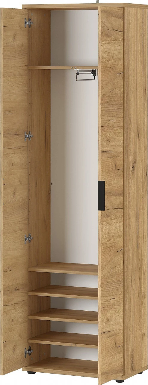 · Garderobenschrank mit zwei Türen, dahinter fünf Einlegeböden, vier davon verstellbar (jeweils belastbar bis zu 10 kg), Unterboden belastbar bis zu 15 kg, mit ausziehbarer Kleiderstange am festen Boden (belastbar bis zu 7 kg), ein Kantengriff aus Metall in schwarz, vier schwarze Möbelgleiter, im Dekor Navarra-Eiche-Nb., hochwertige ABS-Kanten, Melaminharzbeschichtung, Made in Germany.