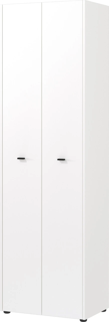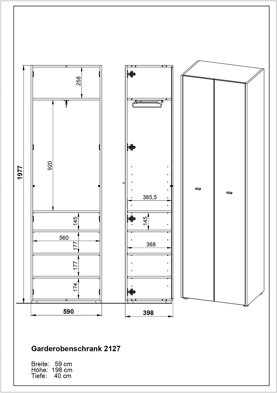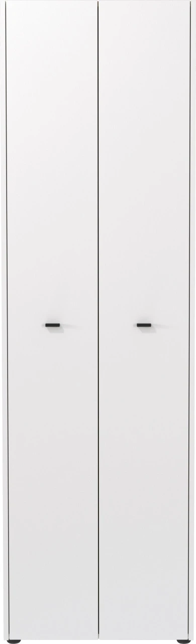 · Garderobenschrank mit zwei Türen, dahinter ein fester Einlegeboden mit ausziehbarer Kleiderstange aus Metall (belastbar bis zu 7 kg) und vier verstellbare Einlegeböden (jeweils belastbar bis zu 10 kg), Unterboden bis zu 10 kg, Ober-, Unter-, und Einlegeböden in Navarra-Eiche-Nb, Rest in Weiß, zwei Steggriffe aus pulverbeschichtetem Metall in Schwarz, vier schwarze Möbelgleiter aus Kunststoff, Türen schließen durch integrierten Dämpfer langsam, sanft und geräuschlos, kratzfeste und widerstandsfähige Oberflächenbeschichtung, stoß- und schlagfeste Kanten, umweltfreundlich, ohne Styropor verpackt, Made in Germany.